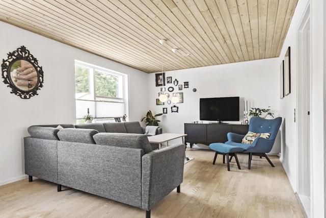 Dejligt lys stue, med vinduerne mod øst og massivt trægulv, som i køkken og stue. Fra tv-stuen er der indgang til værelse. Værelset er med indbygget skab og med en størrelse som gør det ideelt som soveværelse. Fra stuen går man videre ud til entréen fra Stationsvej, som har opgang til 1. sal.