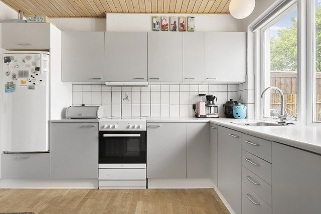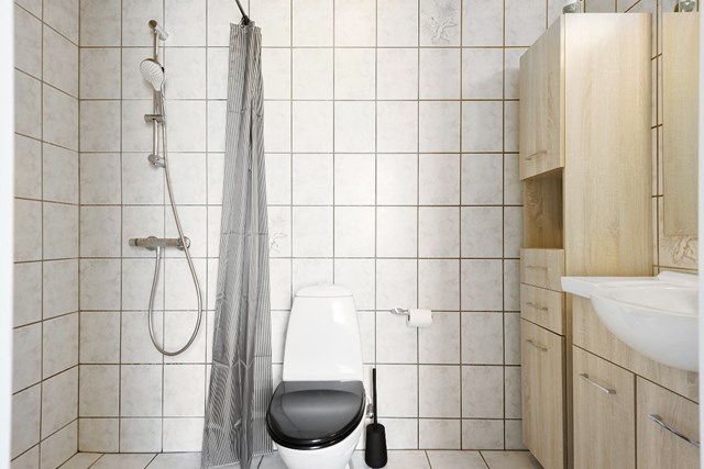 Villaen er indrettet med bryggers. Herfra er badeværelset, med bruseniche og lyst skabsarrangement. Der er gulvvarme i bryggers samt i badeværelset. Fra bryggers er køkkenet med udsigt til gårdhave samt have. Lysegrå låger i bryggers og køkken er fra foråret 2023. Videre herfra er stuen, som er med plads til både spisestue og tv-stue i ét.